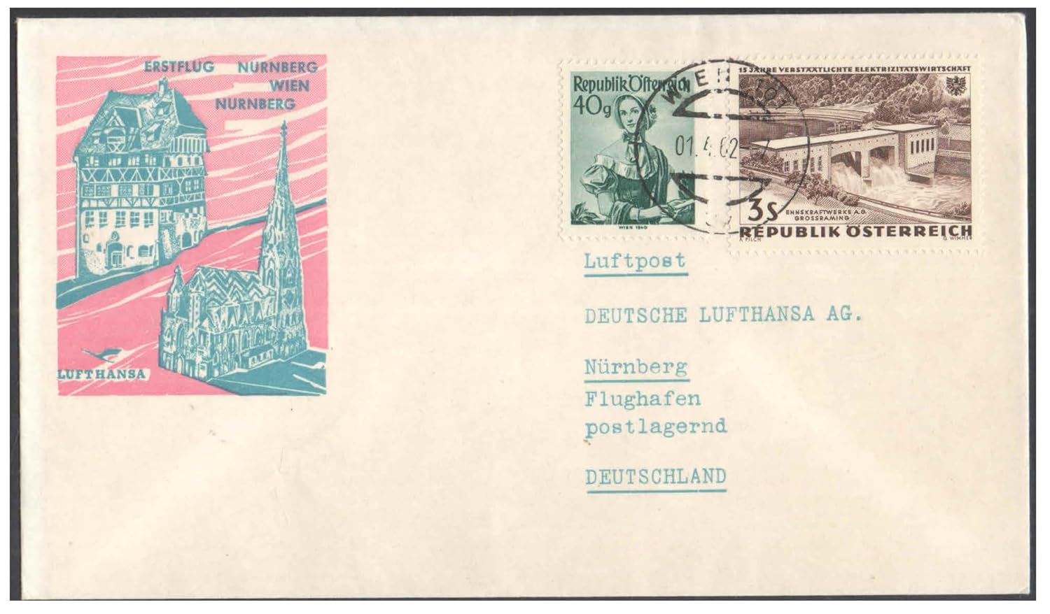 1962 First Flight Cover – (01 April 1962) Nuremberg (Germany) to Vienna (Austria) – for Stamp, philatelic Collection