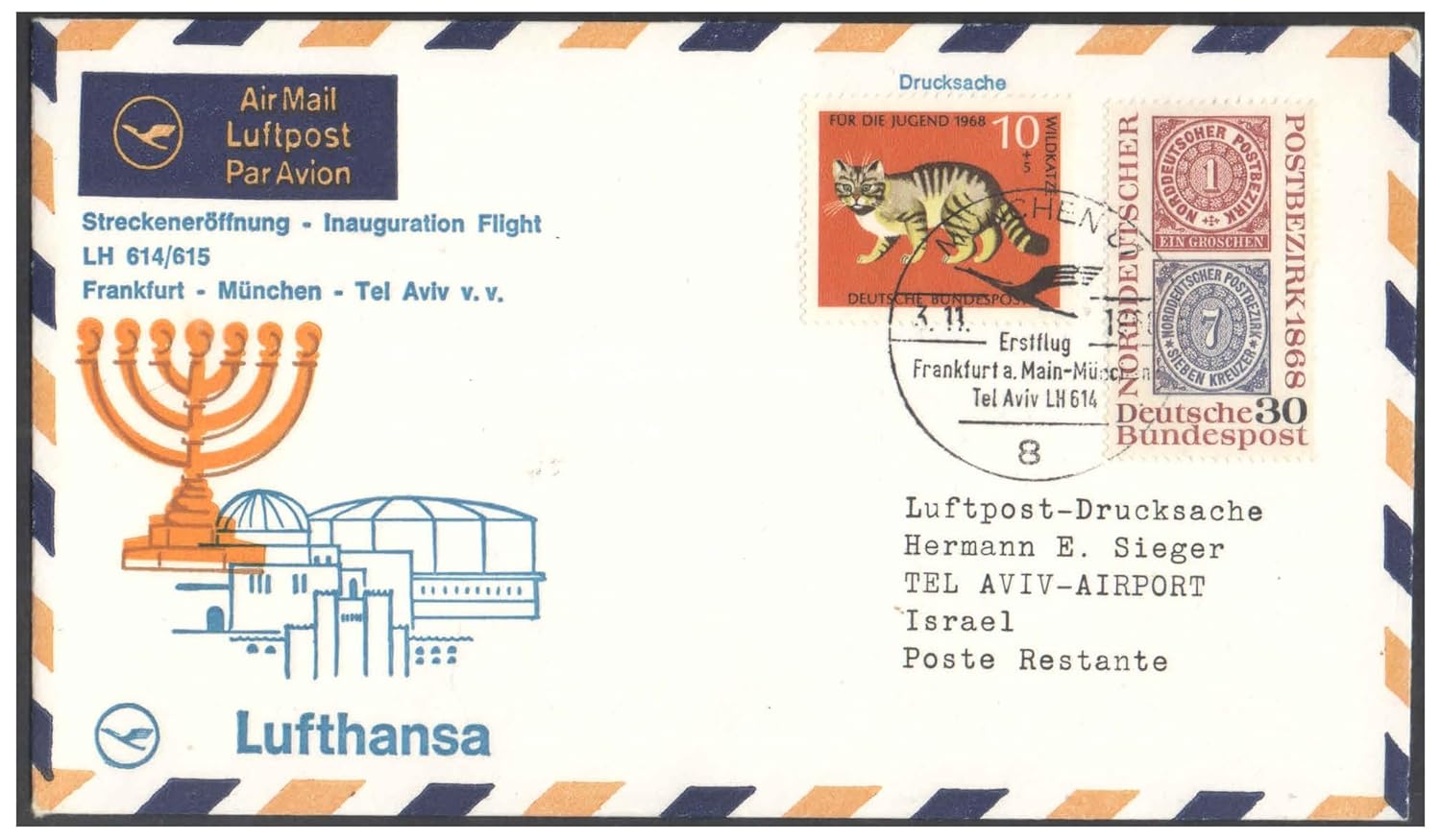 1968 First Flight Cover – (03 November 1968) – Frankfurt (Germany) to TEL Aviv (Israel) – for Stamp,philatelic Collection (B)