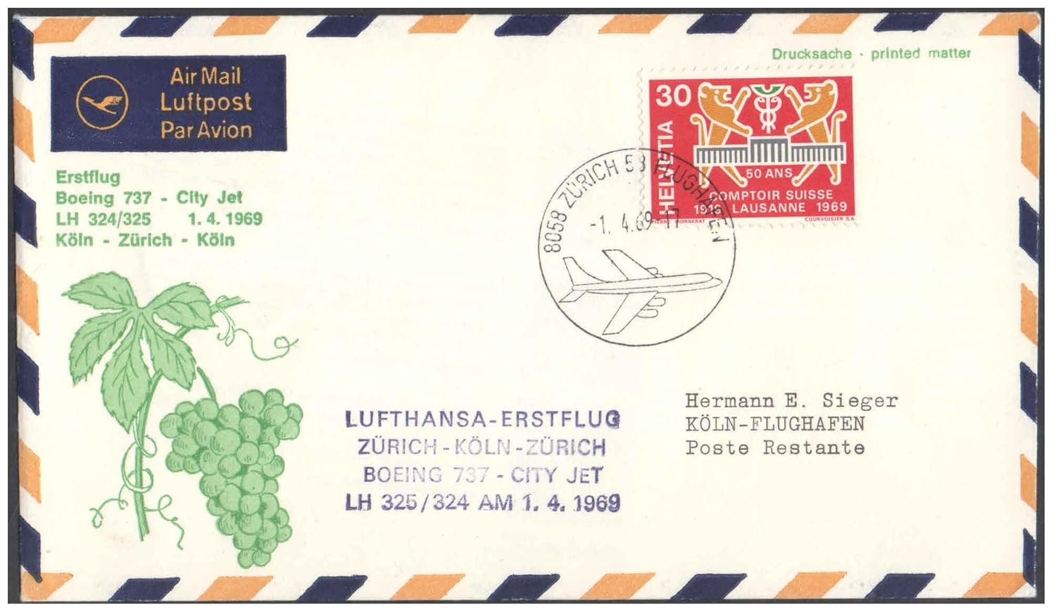 1969 First Flight Cover – (01 April 1969) – Cologne (Germany) to Zurich (Switzerland) – for Stamp, philatelic Collection (B)