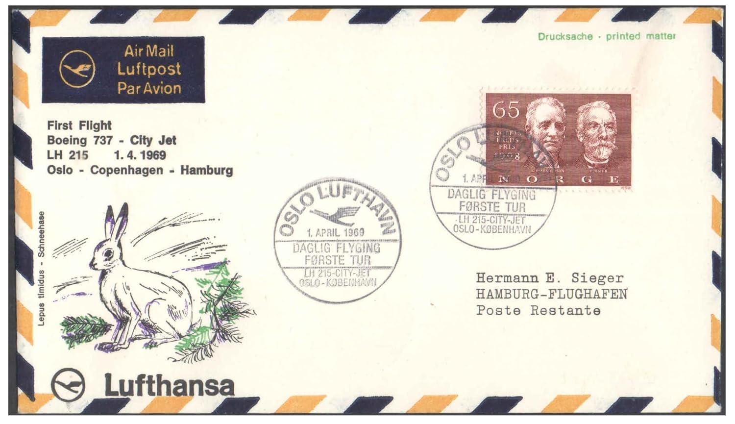 1969 First Flight Cover – (01 April 1969) – Oslo (Norway) to Hamburg (Germany) – for Stamp, philatelic Collection (A)