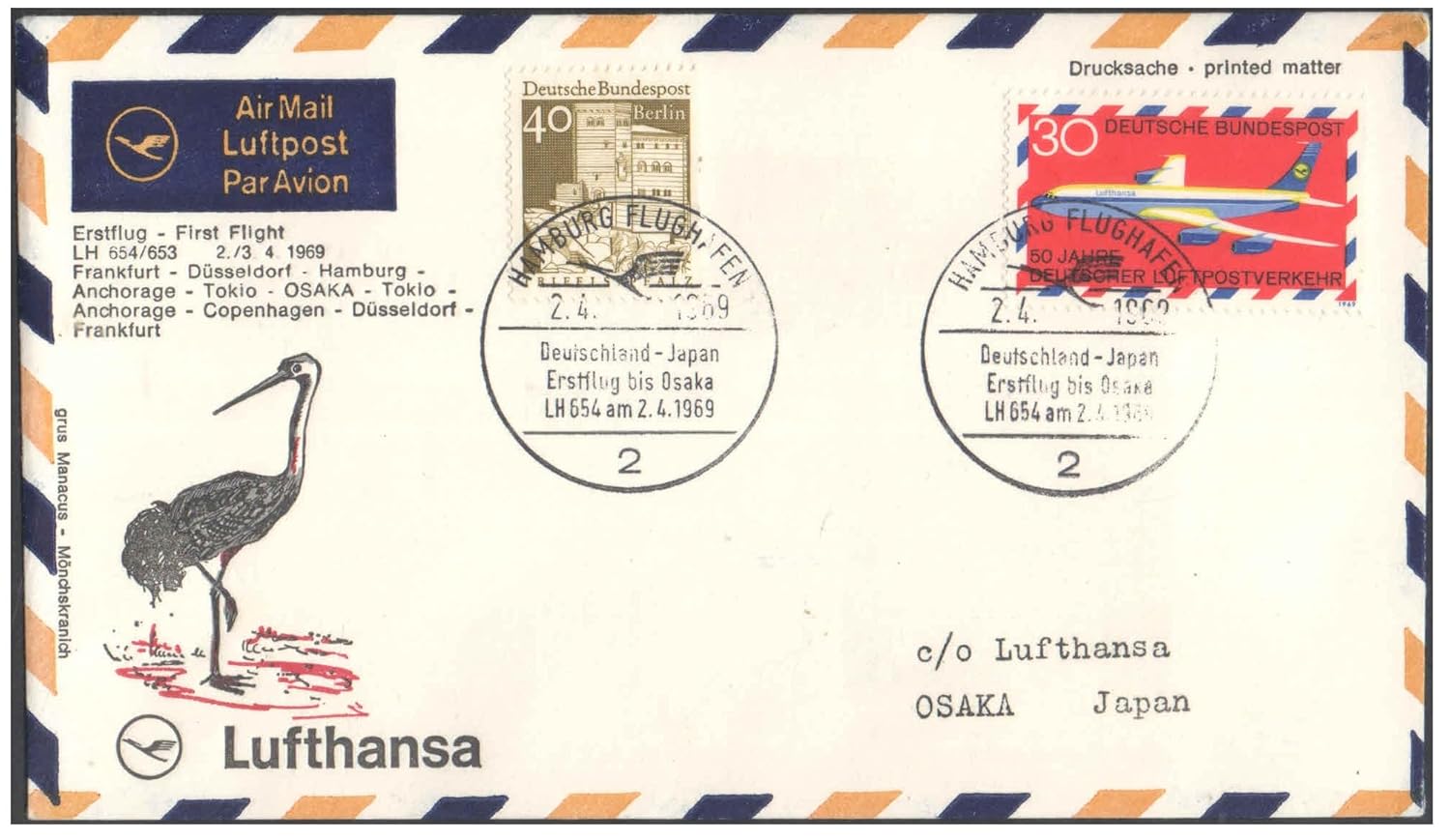 1969 First Flight Cover – (02 April 1969) – Frankfurt (Germany) to Osaka (Japan) – for Stamp, philatelic Collection (C)