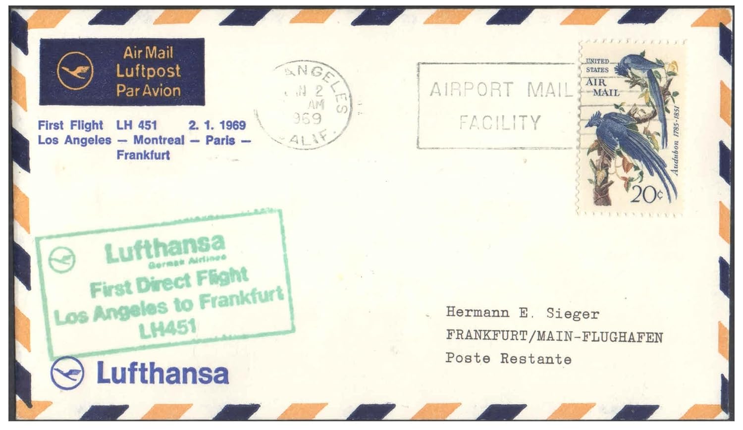 1969 First Flight Cover – (02 January 1969) – Los Angeles (USA) to Frankfurt (Germany) – for Stamp, philatelic Collection