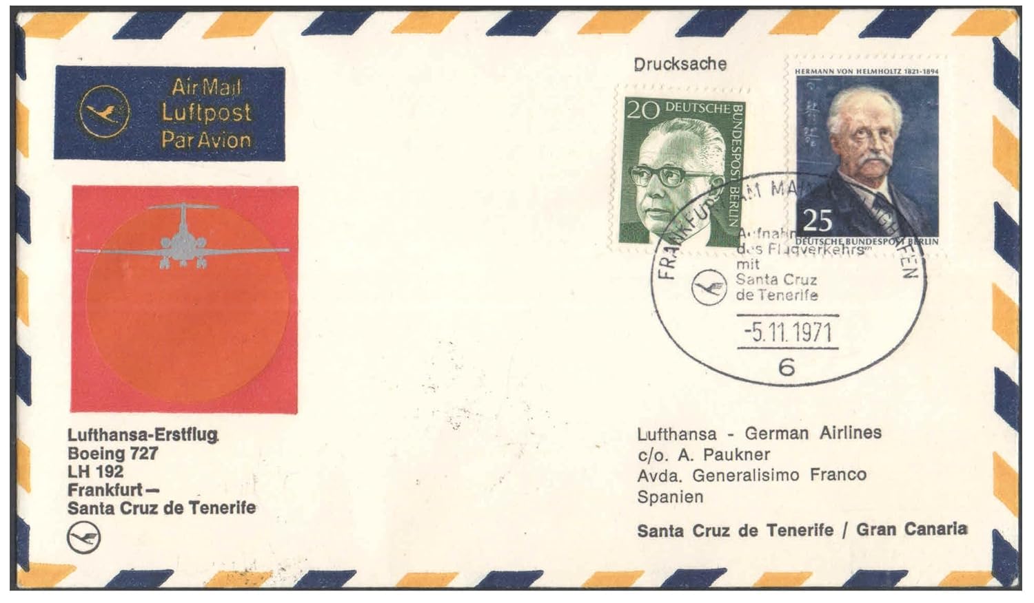 1971 First Flight Cover – (05 November 1971) – Frankfurt (Germany) to Santa Cruz DE Tenerife (Spain) – for Stamp, philatelic Collection