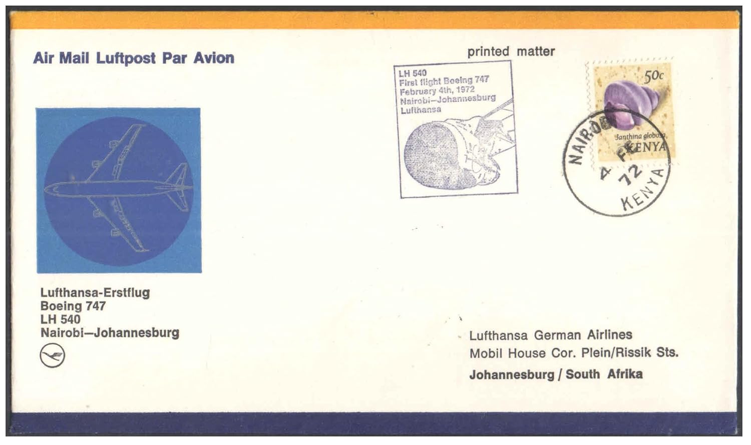 1972 First Flight Cover – (04 February 1972) – Nairobi (Kenya) to Johannesburg (South Africa) – for Stamp, philatelic Collection