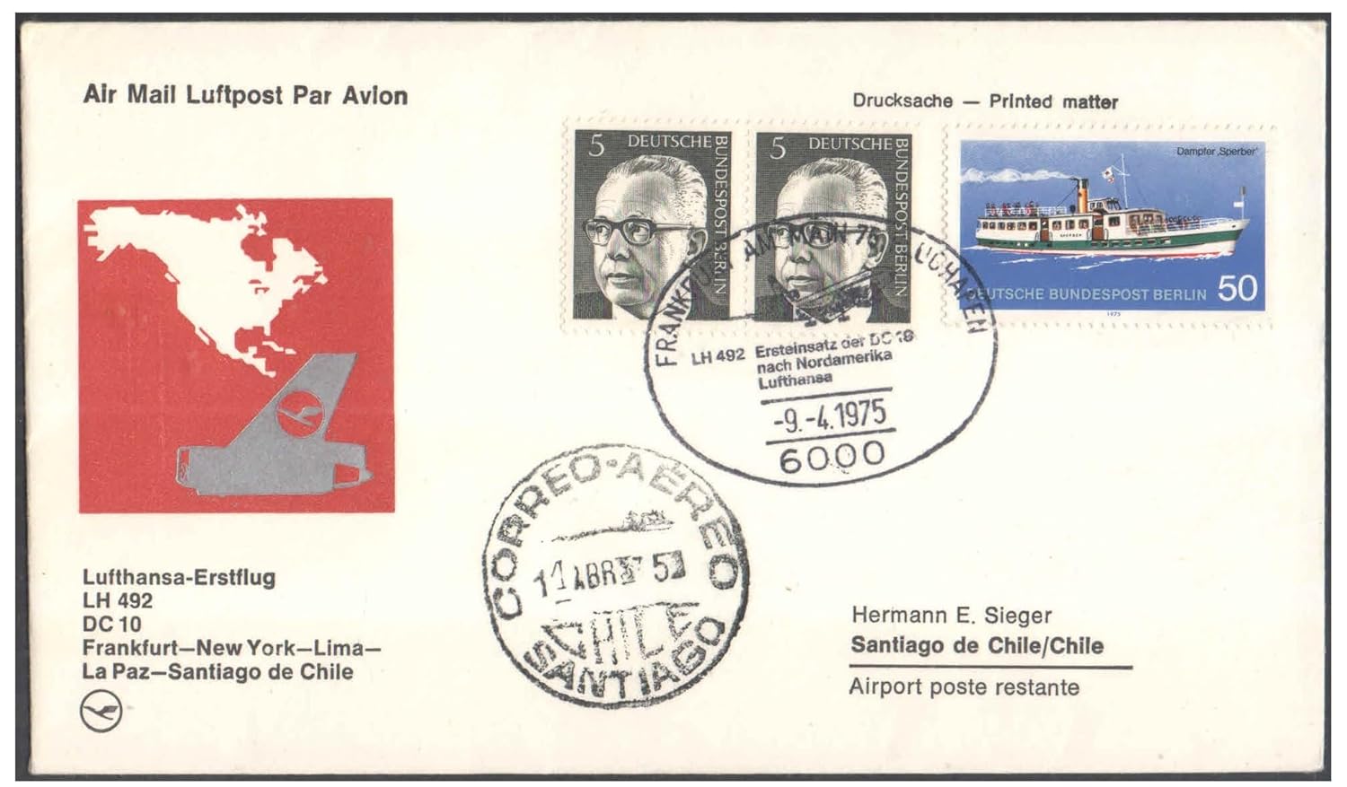 1975 First Flight Cover – (09 April 1975) – Frankfurt (Germany) to Santiago (Chile) – for Stamp, philatelic Collection (B)