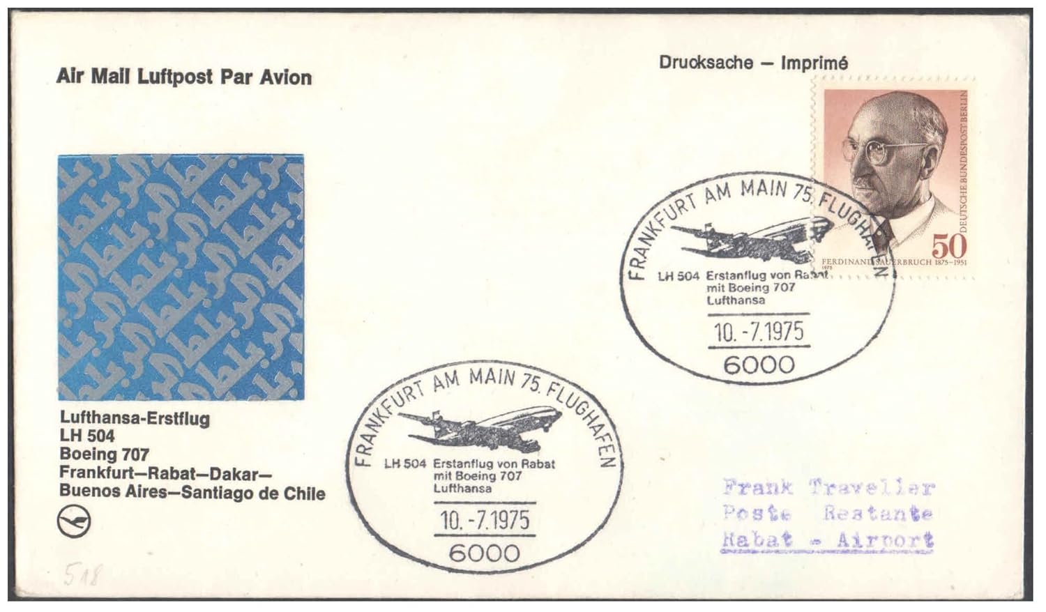 1975 First Flight Cover – (10 July 1975) – Frankfurt (Germany) to Santiago (Chile) – for Stamp, philatelic Collection