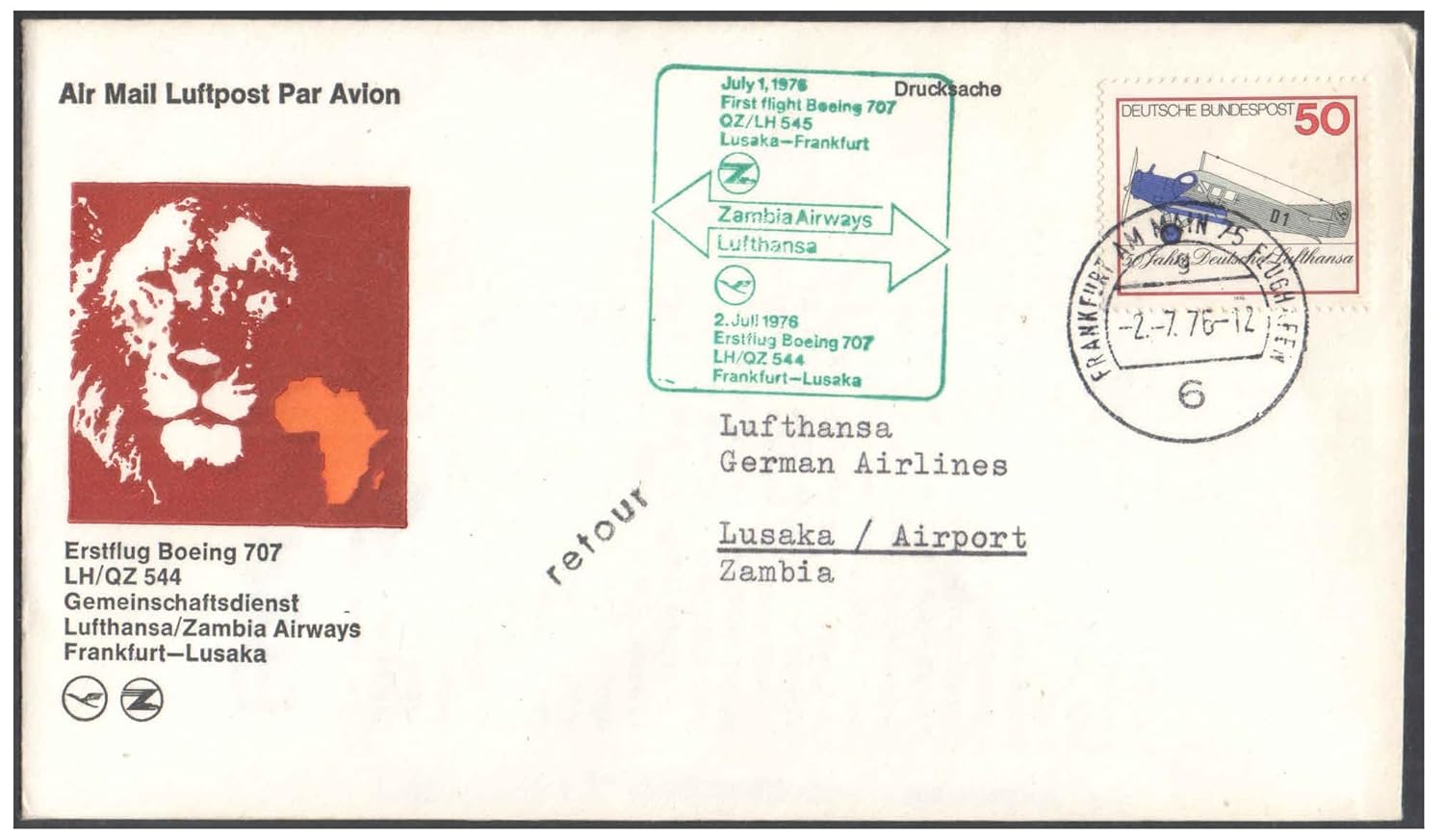 1976 First Flight Cover – (02 July 1976) – Frankfurt (Germany) to Lusaka (Zambia) – for Stamp, philatelic Collection (A)
