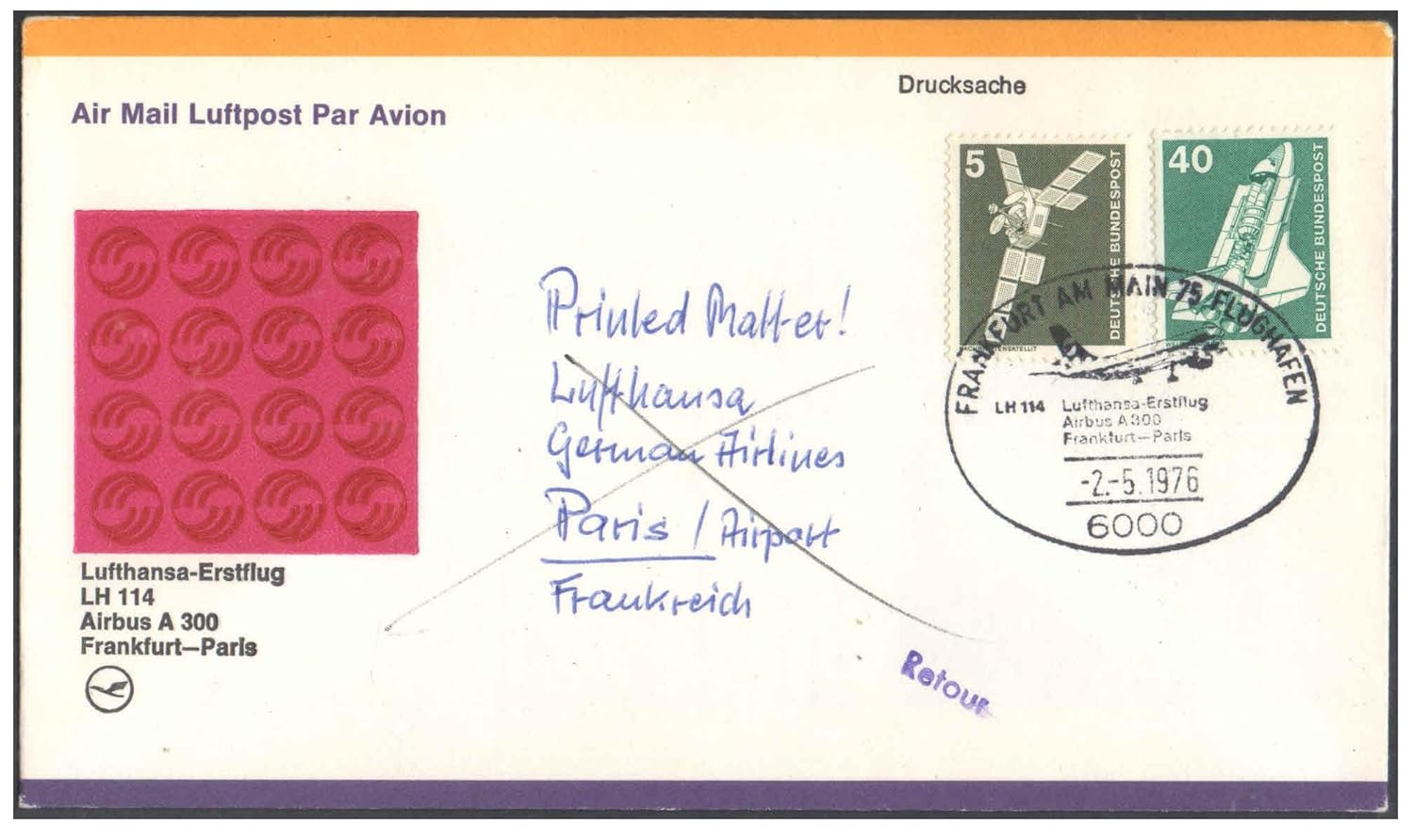 1976 First Flight Cover – (02 May 1976) – Frankfurt (Germany) to Paris (France) – for Stamp, philatelic Collection (B)