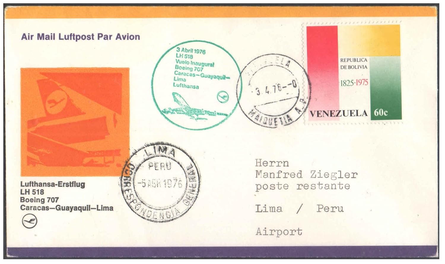 1976 First Flight Cover – (03 April 1976) – Caracas (Venezuela) to Lima (Peru) for Stamp, philatelic Collection