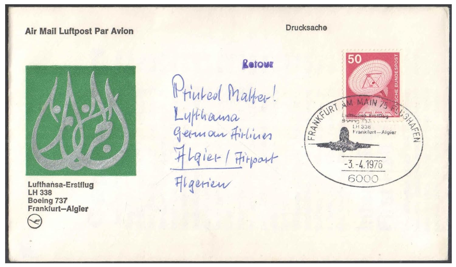 1976 First Flight Cover – (03 April 1976) – Frankfurt (Germany) to Algiers (Algeria) – for Stamp, philatelic Collection