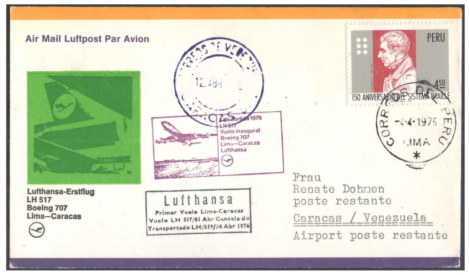 1976 First Flight Cover – (04 April 1976) – Lima (Peru) to Caracas (Venezuela) – for Stamp, philatelic Collection