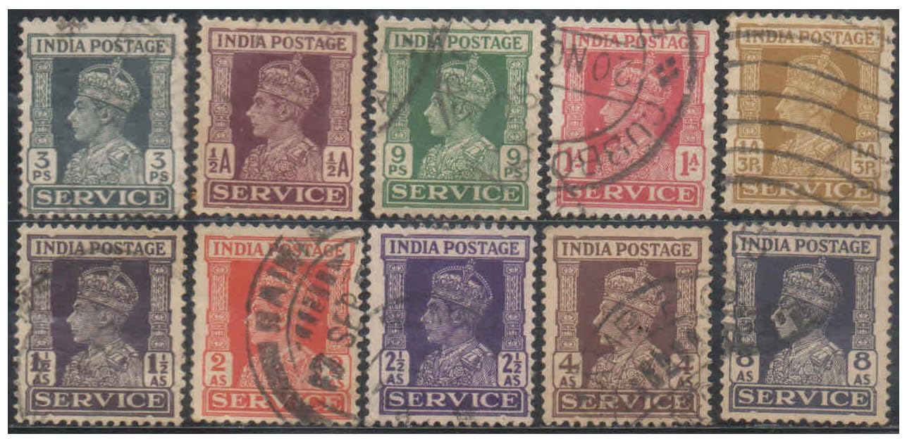 British India 1939 King George VI – Service – Set of 10 Used Stamps for Collection