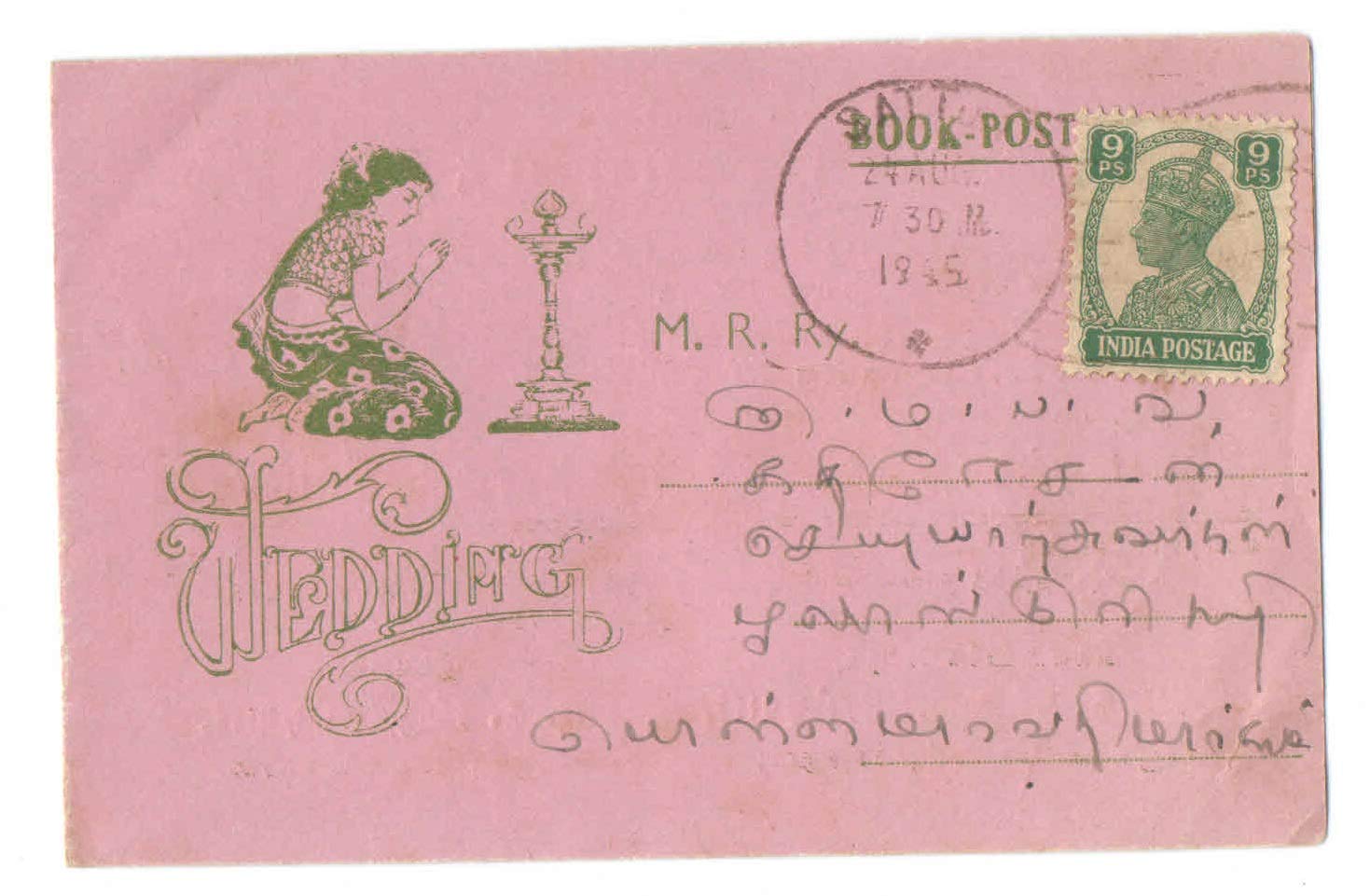 British India 1945 Book Post Cover Dated 24-08-1945 with King George VI 9 Pies Postage Stamp