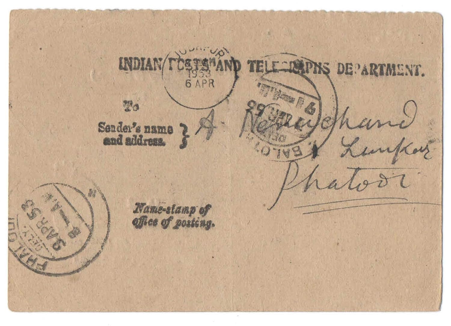India 1953 Acknowledgement of Regd Letter Parcel Dated 09-04-1953