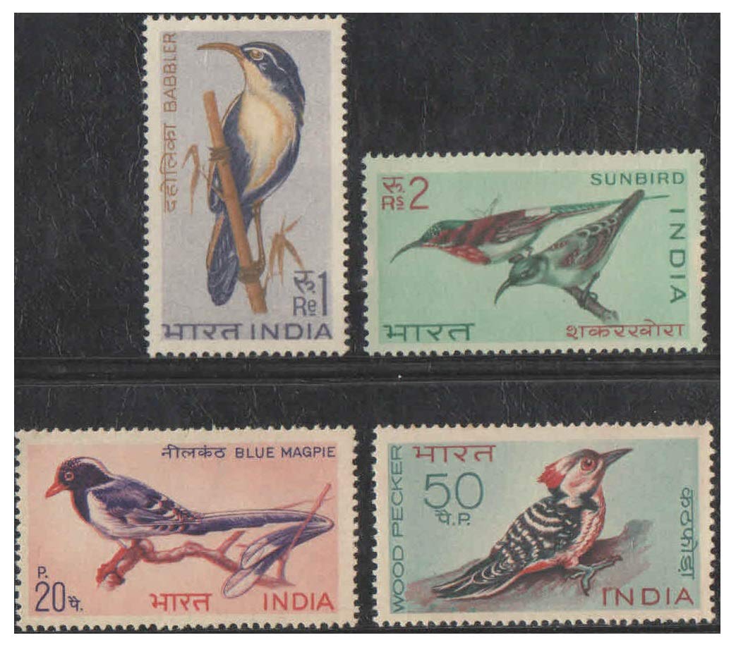 India 1968 Indian Birds ( Red Billed Blue Magpie – Brown Fronted pied Wood Pecker – Slaty Headed Scimtar Babbler – Yellow Backed Sunbird ) Set of 4 Postage Stamps Mint Unhinged