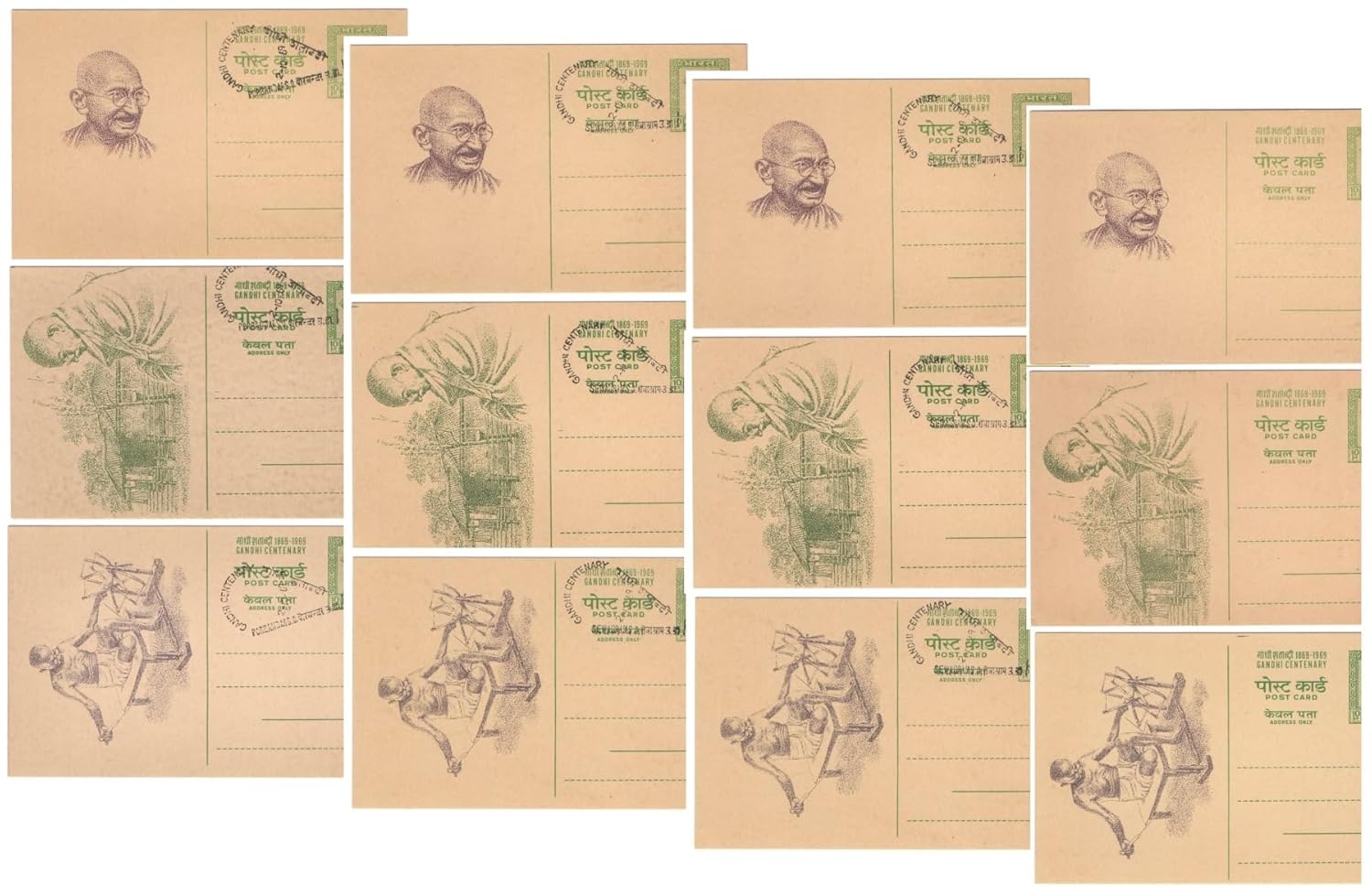 India 1969 Birth Centenary of Mahatma Gandhi – Set of 12 PCs (3 PCs each of Porbandar – Sabarmati & Sewagram P.O. Cancellations & 3 PCs Blank) Multicolor