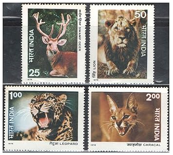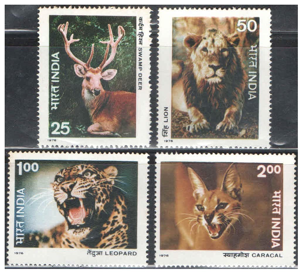 India 1976 Indian Wildlife – Wild Life ( Swamp Deer – Lion – Leopard – Caracal ) – Set of 4 Postage Stamps Mint Unhinged