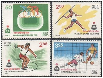 India 1982 IX Asian Games Delhi (Cycling – Javelin Throw – Discus Throw – Football) – Set of 4 Postage Stamps – Mint Unhinged
