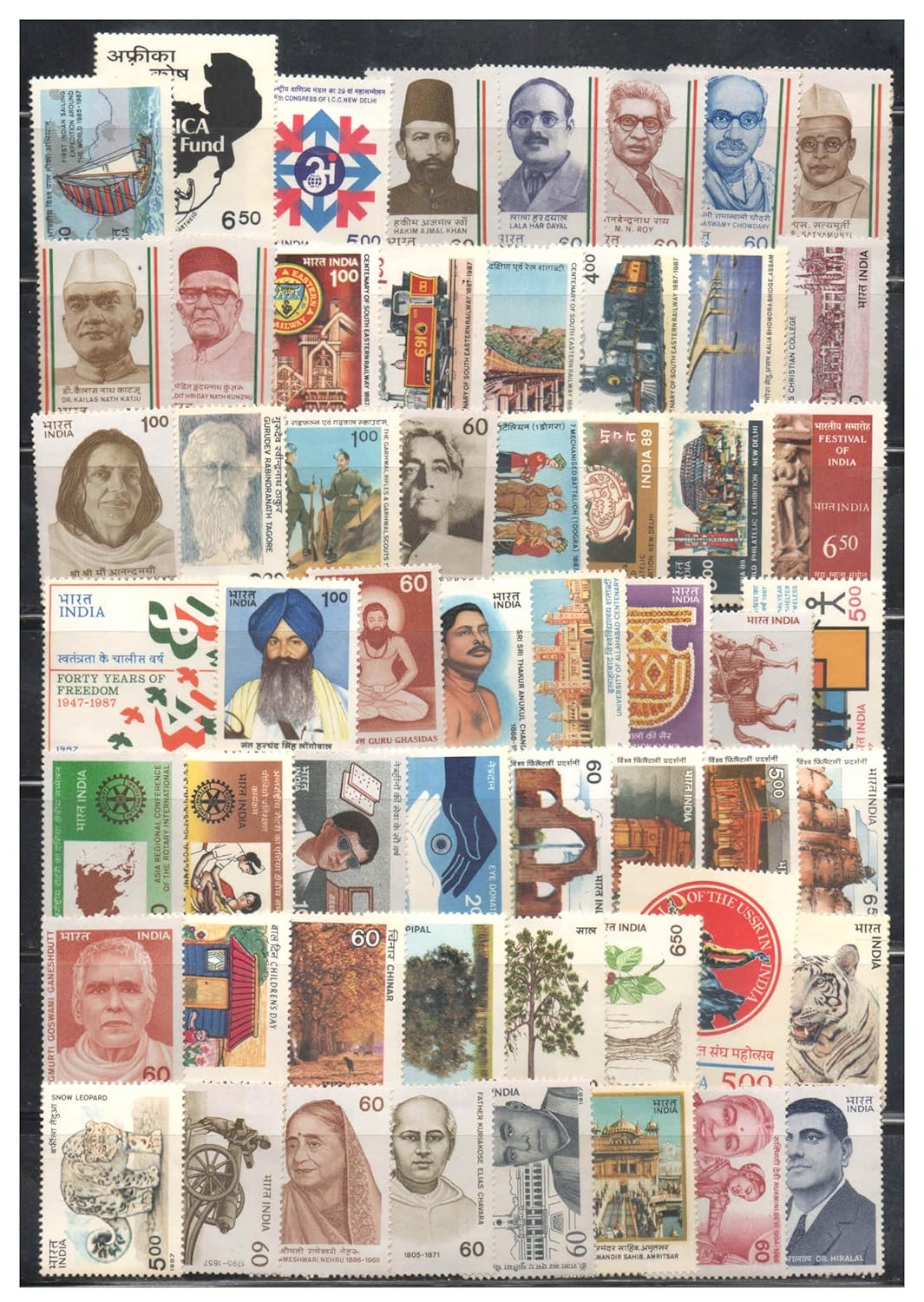 India 1987 Year Pack (Full & Complete Set) of 56 Mint Unhinged Postage Stamps (Some Stamps Have Brown Gum/Stains on The Back)