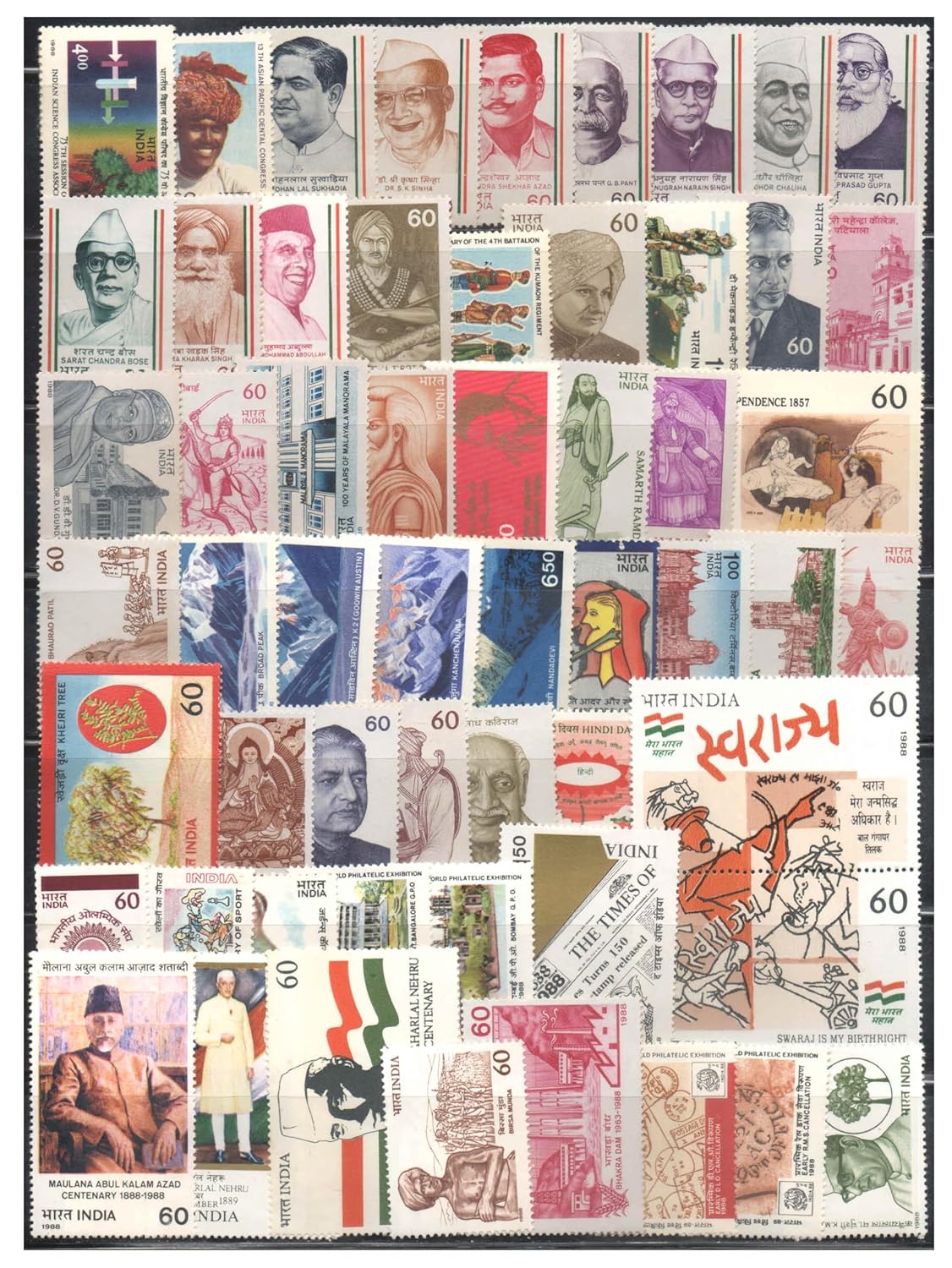 India 1988 Year Pack (Full & Complete Set) of 57 Mint Unhinged Postage Stamps (Some Stamps Have Brown Gum/Stains on The Back)