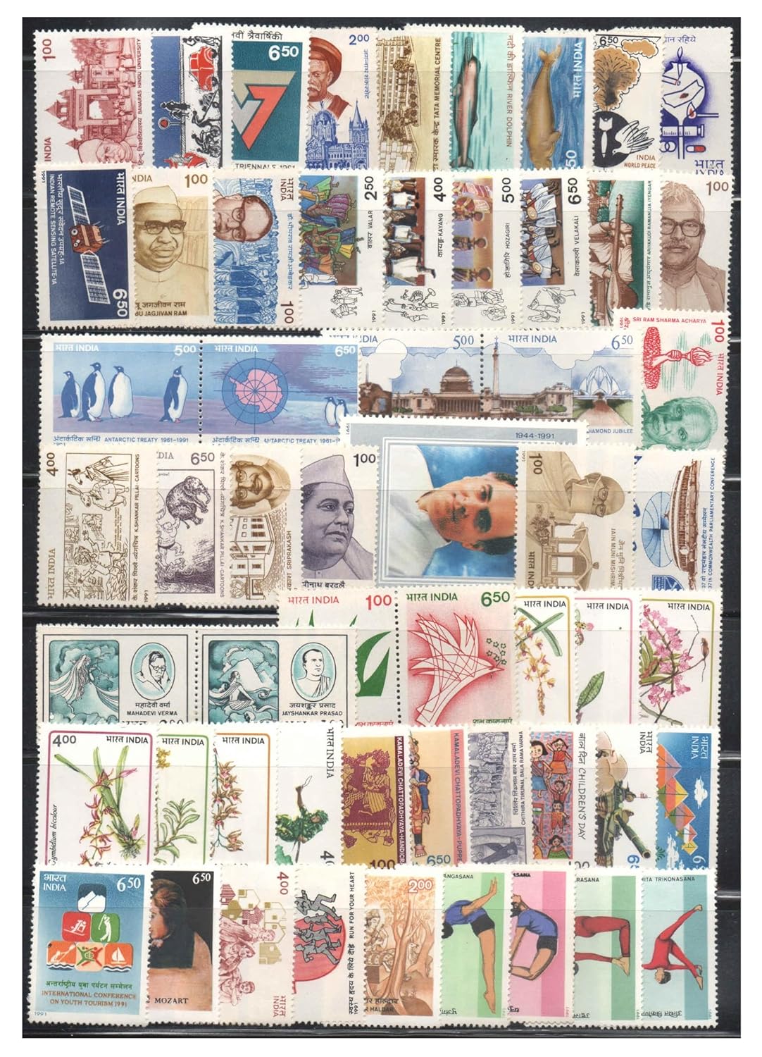 India 1991 Year Pack (Full Complete Year Pack – Year Set) of 56 Postage Stamps (Including Antarctic Treaty Mahadevi Verma & Delhi Se-tenants) Mint Unhinged