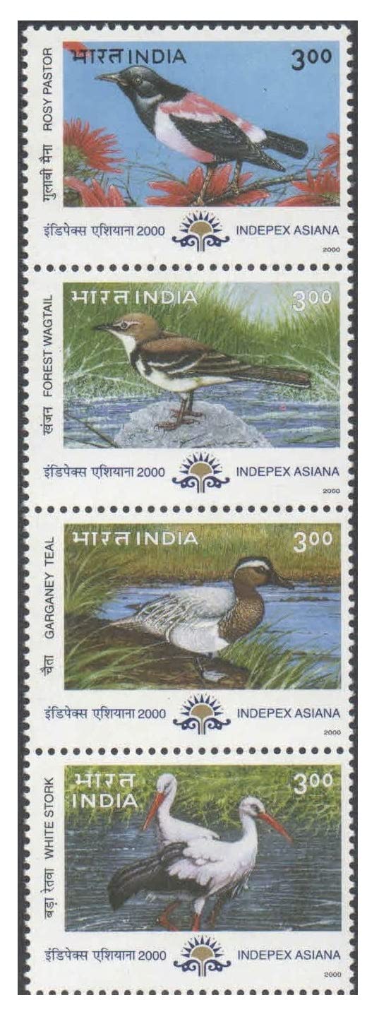 India 2000 Indepex Asiana 2000 Migratory Birds ( Rosy Pastor – Garganey Teal – Forest Wagtail – White Stork ) Vertical Se-Tenant Strip of 4 Postage Stamps Mint Never hinged