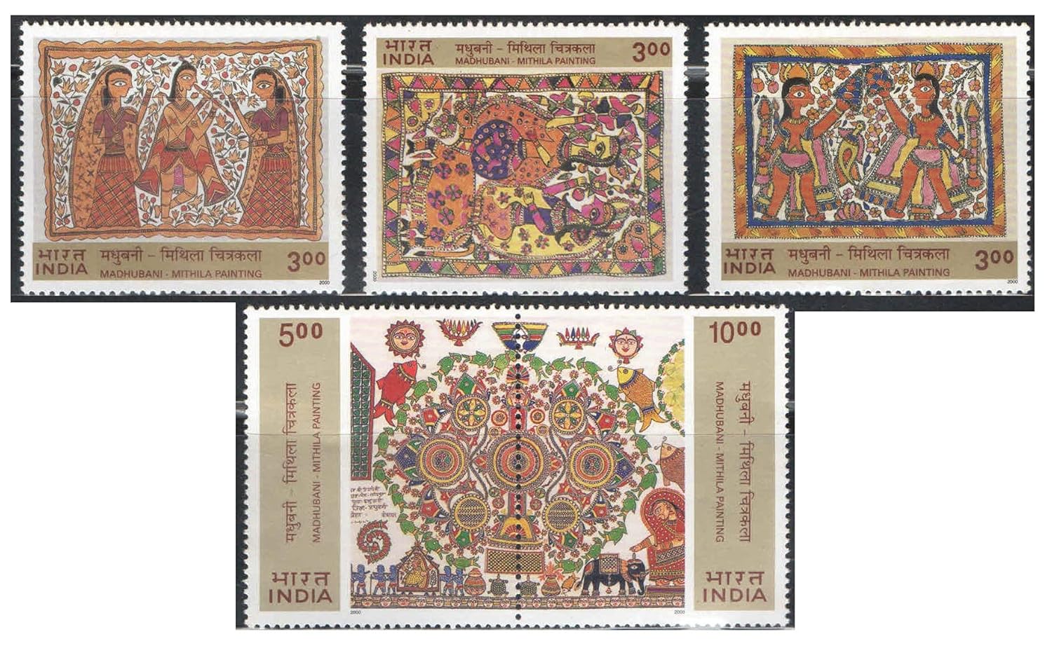 India 2000 Madhubani Mithila Paintings (Set of 3 Stamps + Pair of Se-tenants ) Total 5 Stamps Mint Unhinged