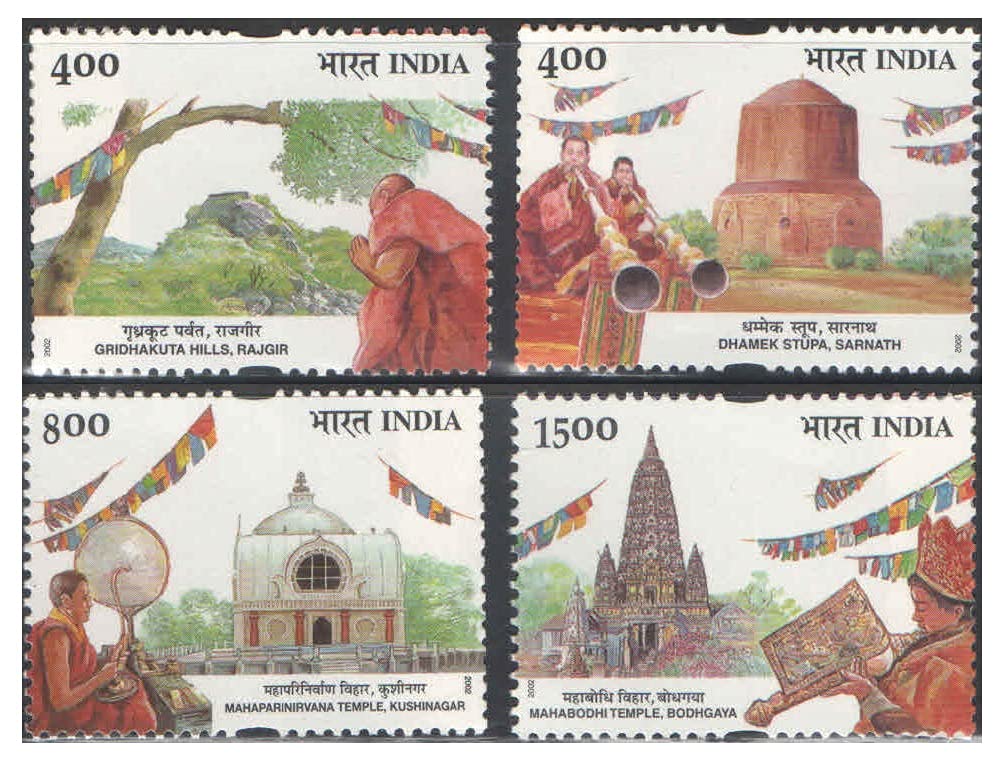 India 2002 Bauddha Mahotsav Festival (Gridhakuta Hills – Dhamek Stupa – Mahaparinirvana Temple Kushinagar – Mahabodi Temple Bodhgaya) Set of 4 Postage Stamps Mint Unhinged
