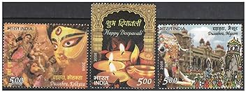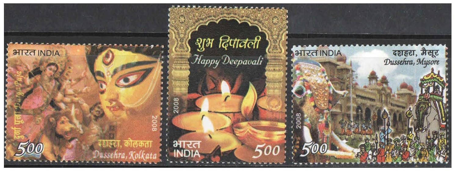 India 2008 Postage Stamp – Festivals of India Diwali ( Deepavali ) & Dussehra – Set of 3 Stamps Mint Unhinged
