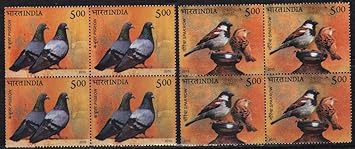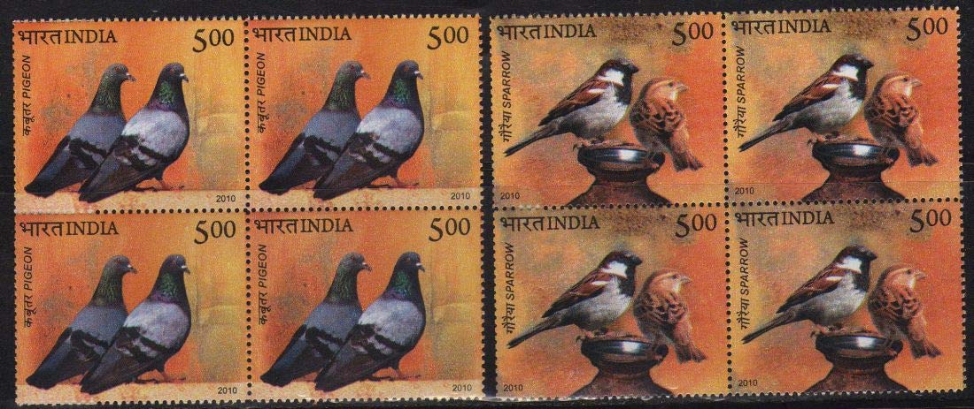 India 2010 Pigeon & Sparrow Set of 2 Blocks of 4 Stamps Each Mint UNHINGED