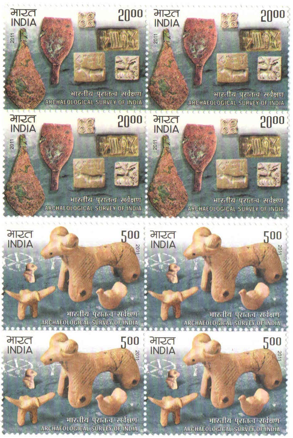 India 2011 Archaeological Survey of India Set of 2 Blocks of 4 Stamps Each (8 Stamps) Mint UNHINGED