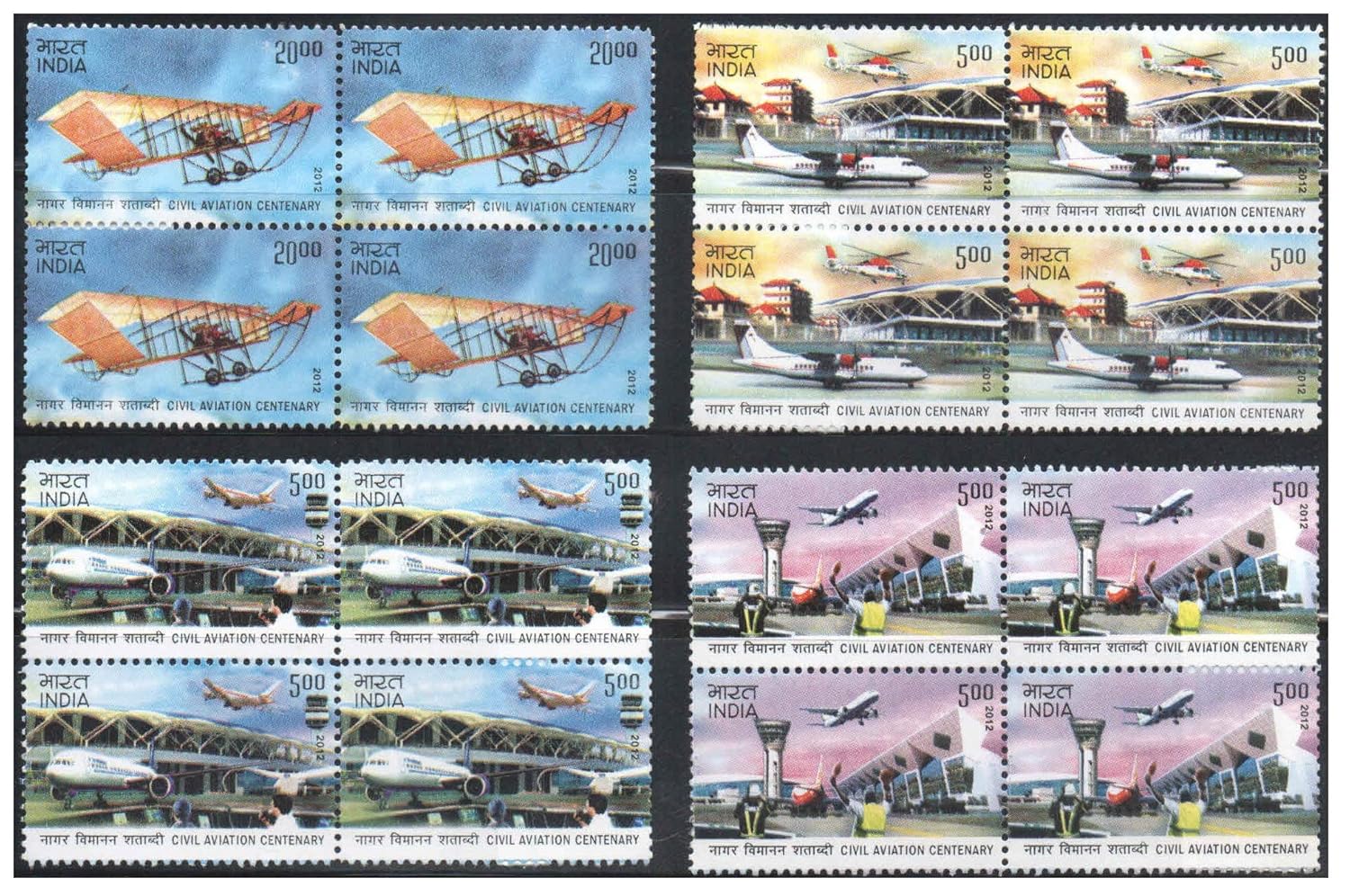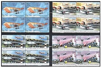 India 2012 Civil Aviation Centenary – Set of 4 Blocks of 4 Postage Stamps Each (Total 16 Stamps) Mint Unhinged