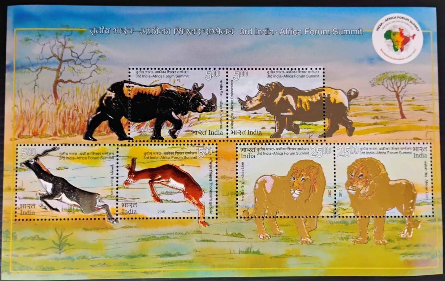 India 2015-3rd India Africa Forum Summit – Metallic Folied & Embossed Stamps – Miniature Sheet of 6 Postage Stamps