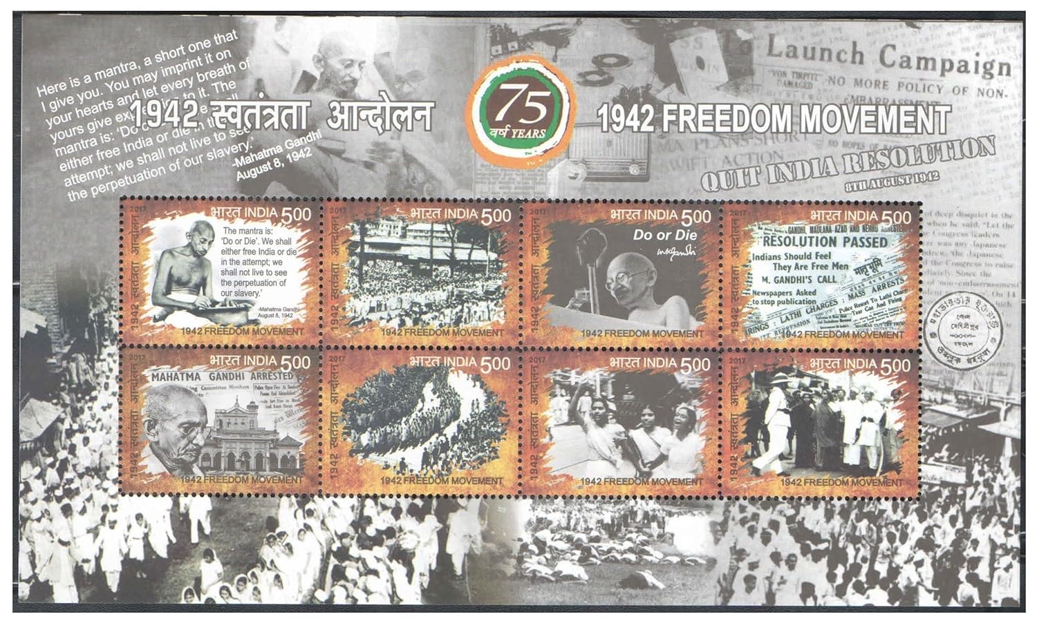 India 2017 – Freedom Movement 1942 – Miniature Sheet of 8 Postage Stamps