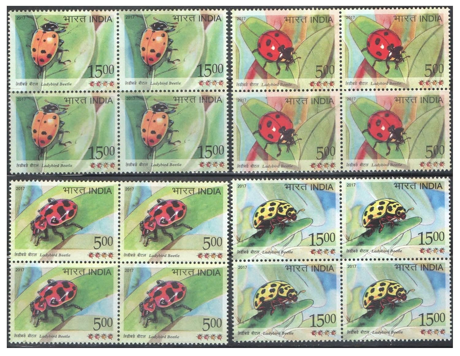 India 2017 Ladybird Beetles – Set of 4 Blocks of 4 Stamps Each (Total 16 Stamps) Mint Unhinged, Multicolor, for Collection