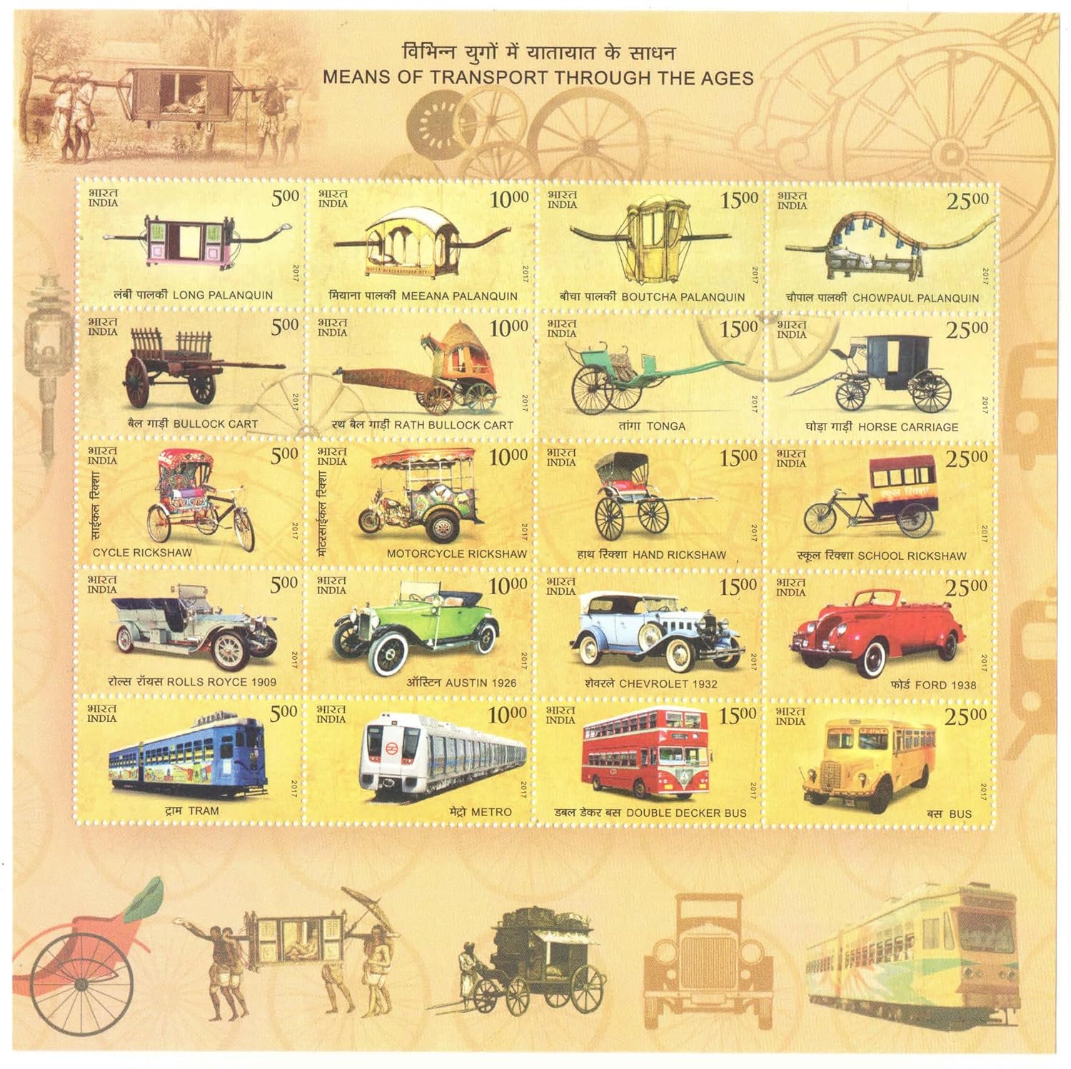 India 2017 Means of Transport Through The Ages – Mixed Sheetlet containing 20 Different Postage Stamps – Mint, Unhinged, for Collection