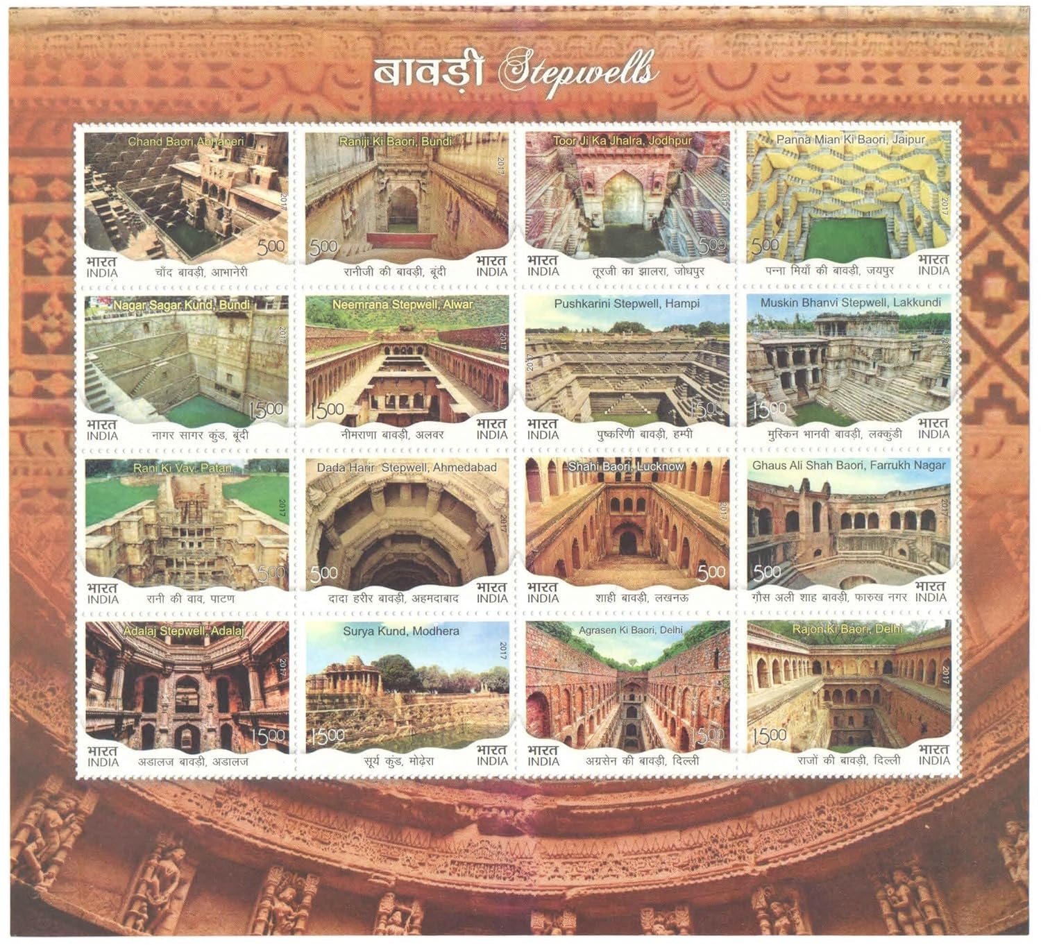 India 2017 Stepwells – Mixed Sheetlet of 16 Postage Stamps – Mint Unhinged