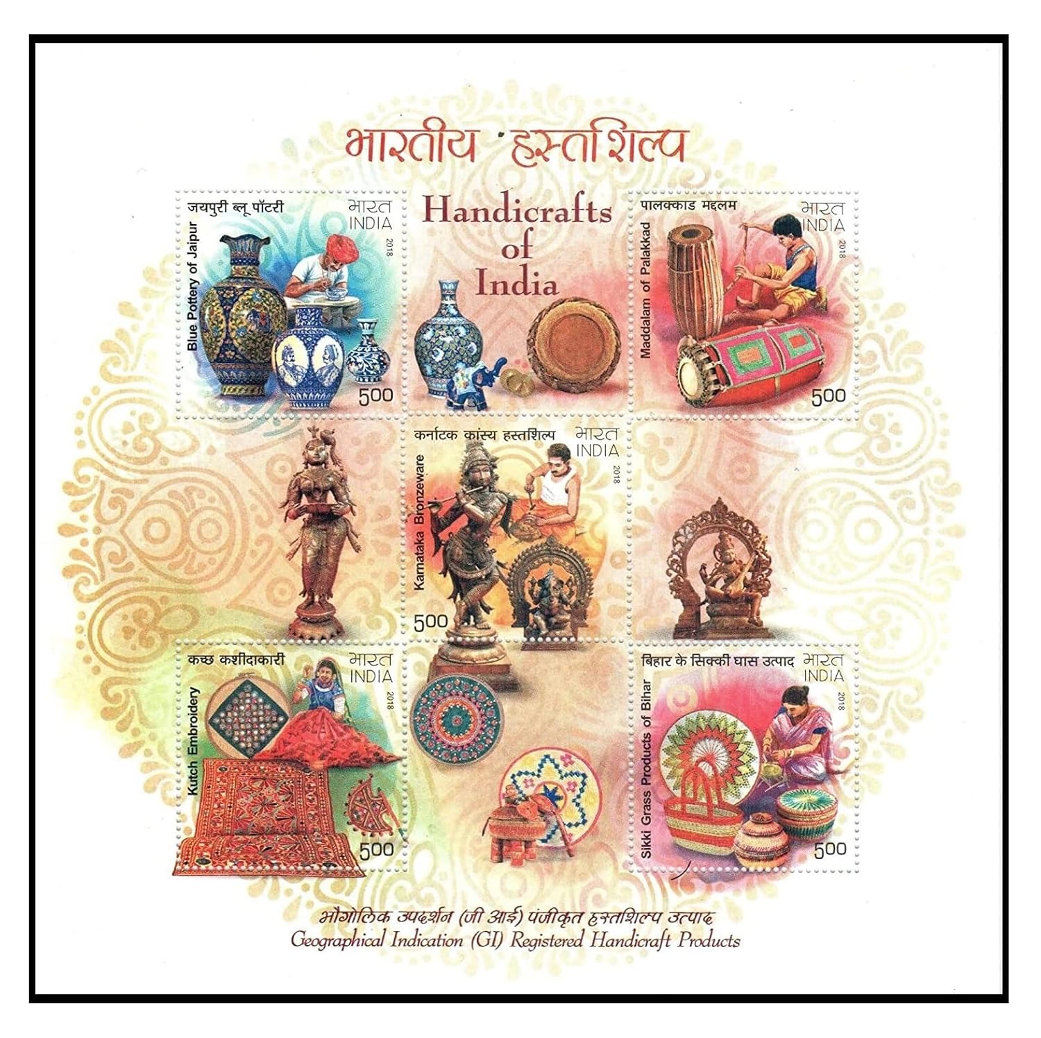 India 2018 Handicrafts of India – Geographical Indication (GI) Registered Handicraft Products Miniature Sheet MS of 5 Postage Stamps Mint Unhinged