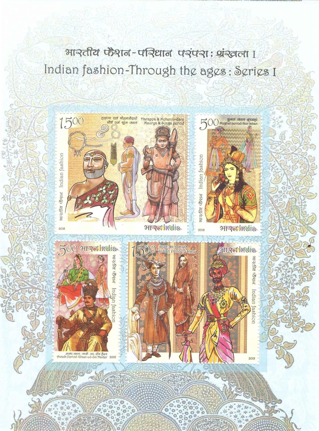 India 2018 Indian Fashion – Through The Ages Series1 – Miniature Sheet MS of 4 Postage Stamps ( Noorjahan – Awadh – Mohenjodaro – Princely States Mint Unhinged