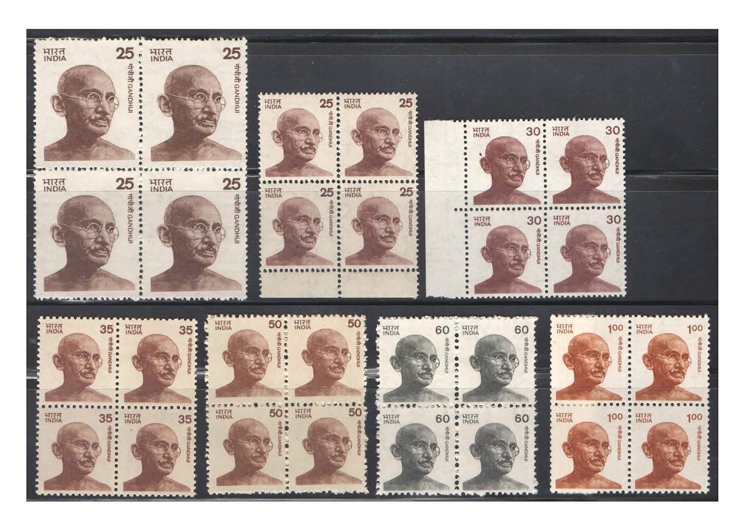 India Postage 1974 – 1983 Mahatma Gandhi Special Definitive Series – Complete Set of 7 Blocks of 4 Postage Stamps Each (Total 28 Stamps) MNH