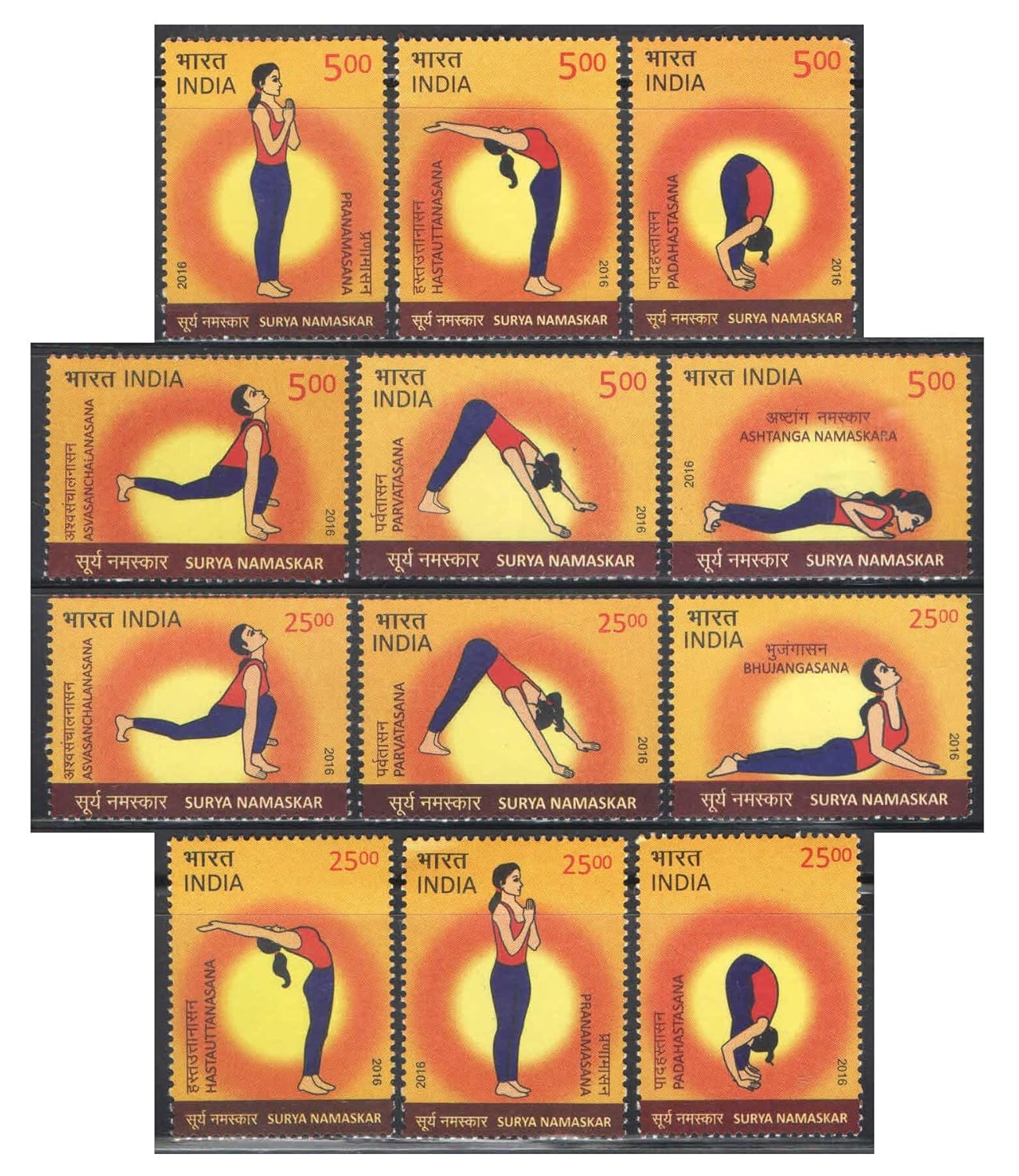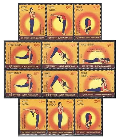 India Postage 2016 – Surya Namaskar ( Sun Salutation ) – Set of 12 Postage Stamps Mint Never Hinged