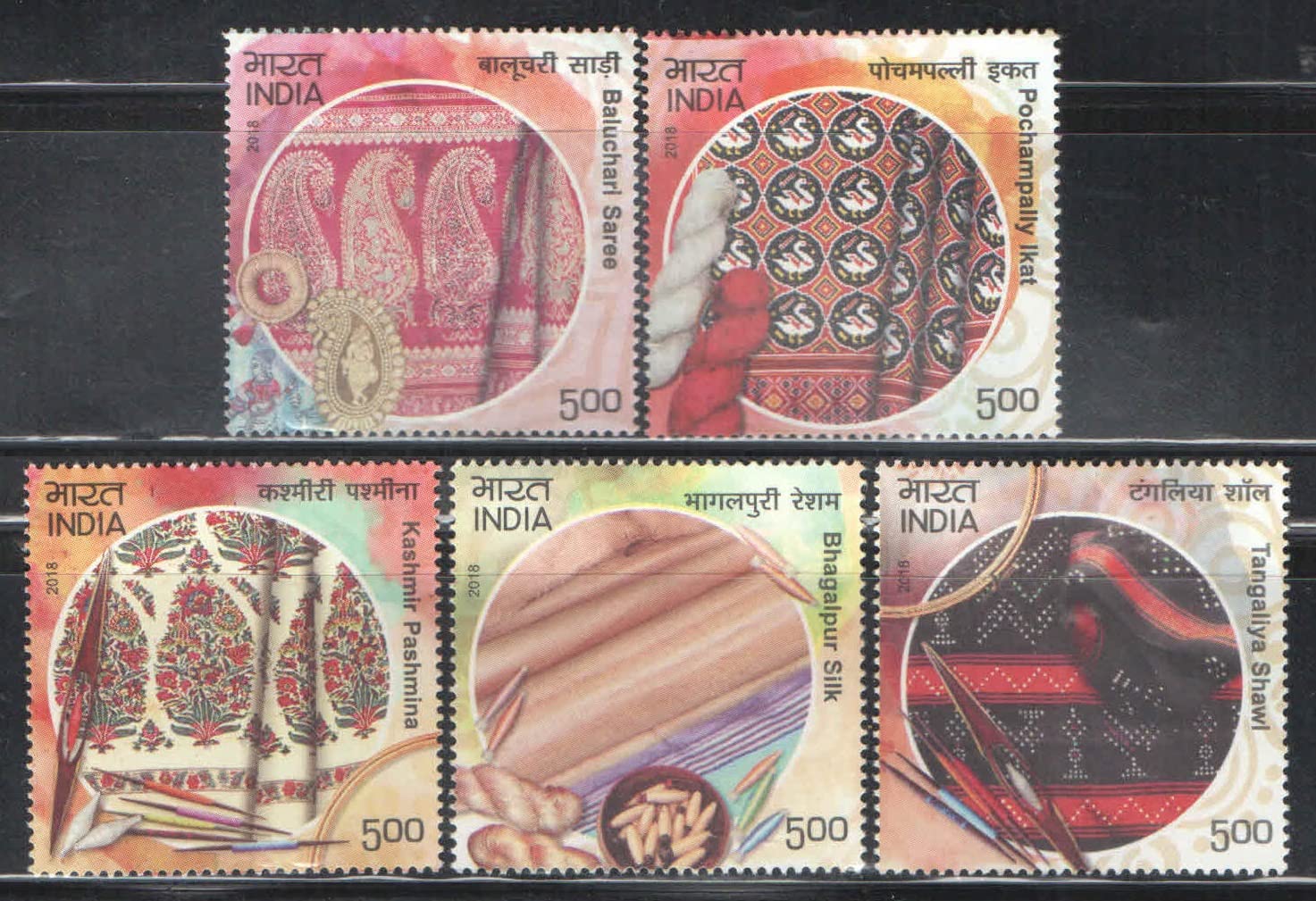 India Postage 2018 – Handlooms of India ( Baluchari Saree – Pochampally Ikat – Kashmir Pashmina – Bhagalpur Silk – Tangaliya Shawl ) – Set of 5 Postage Stamps Mint Never Hinged