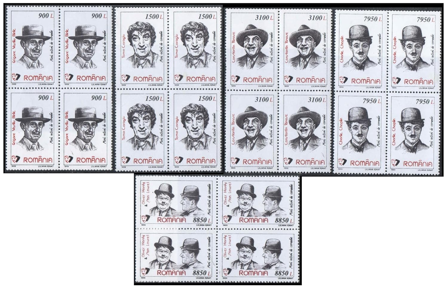 Romania 1999 Comic Actors (Comedians) – Set of 5 Blocks of 4 Postage Stamps Each (Total 20 Stamps) – Mint Never Hinged