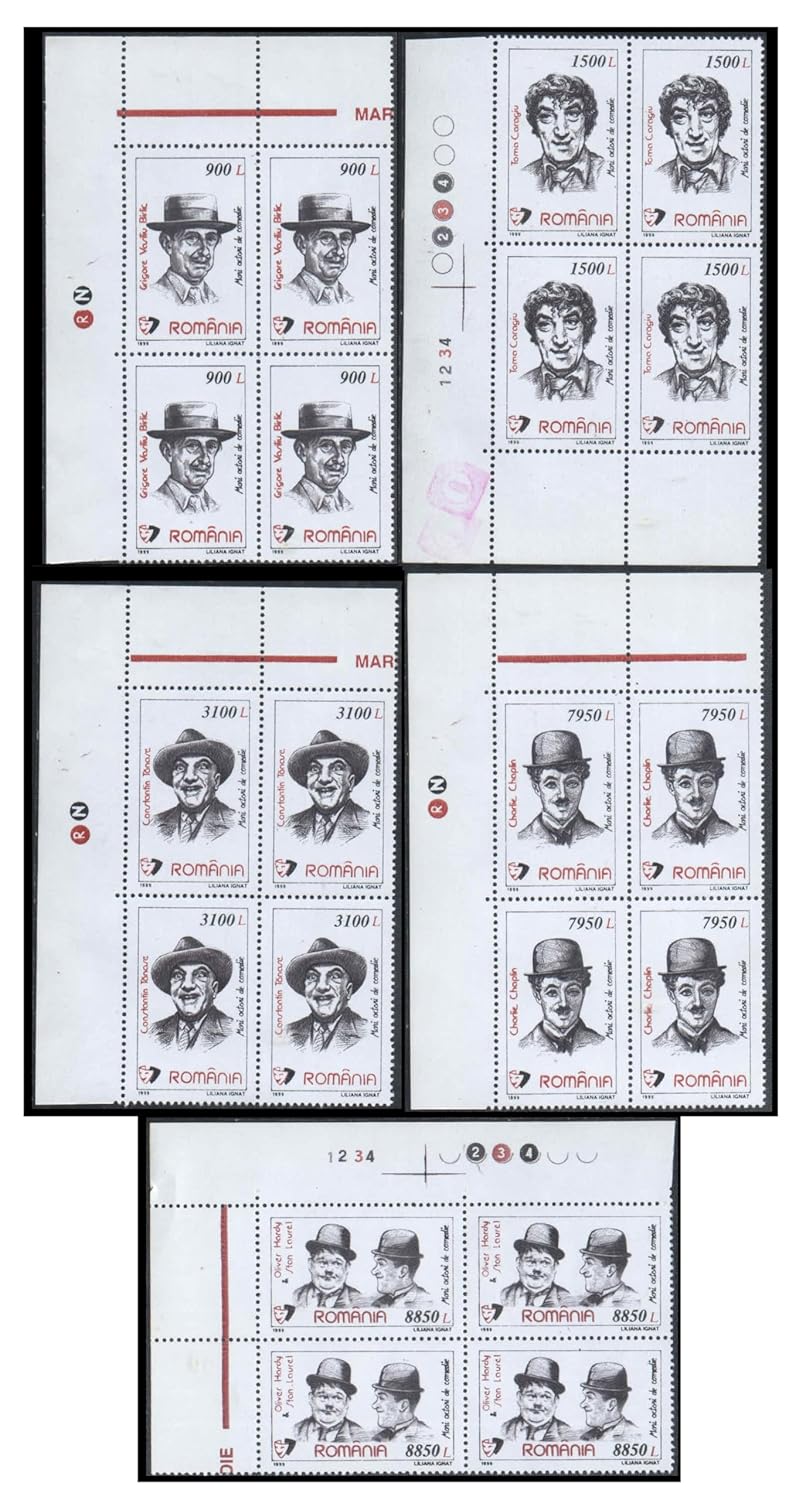 Romania 1999 Comic Actors (Comedians) – Set of 5 TL Blocks of 4 Postage Stamps Each (Total 20 Stamps with Traffic Lights) – Mint Never Hinged