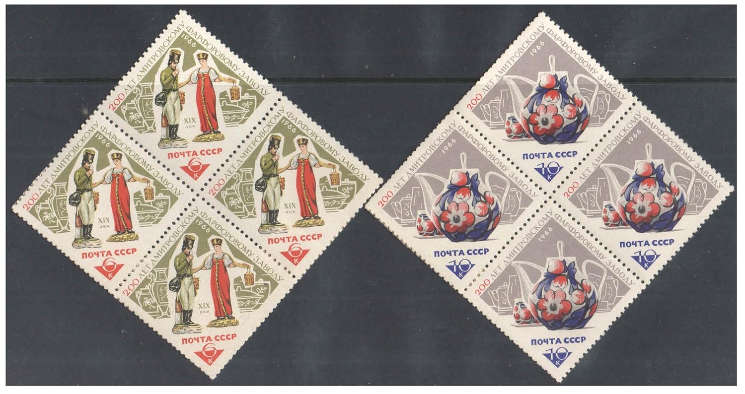 Russia 1966 (USSR-Sovet Union) – The 200th Anniversary of The Ceramic Works of Dmitrov – (Postman – Girl with Yoke) and (Tea Set) – Set of 2 Blocks of 4 MNH Postage Stamps Each for Collection