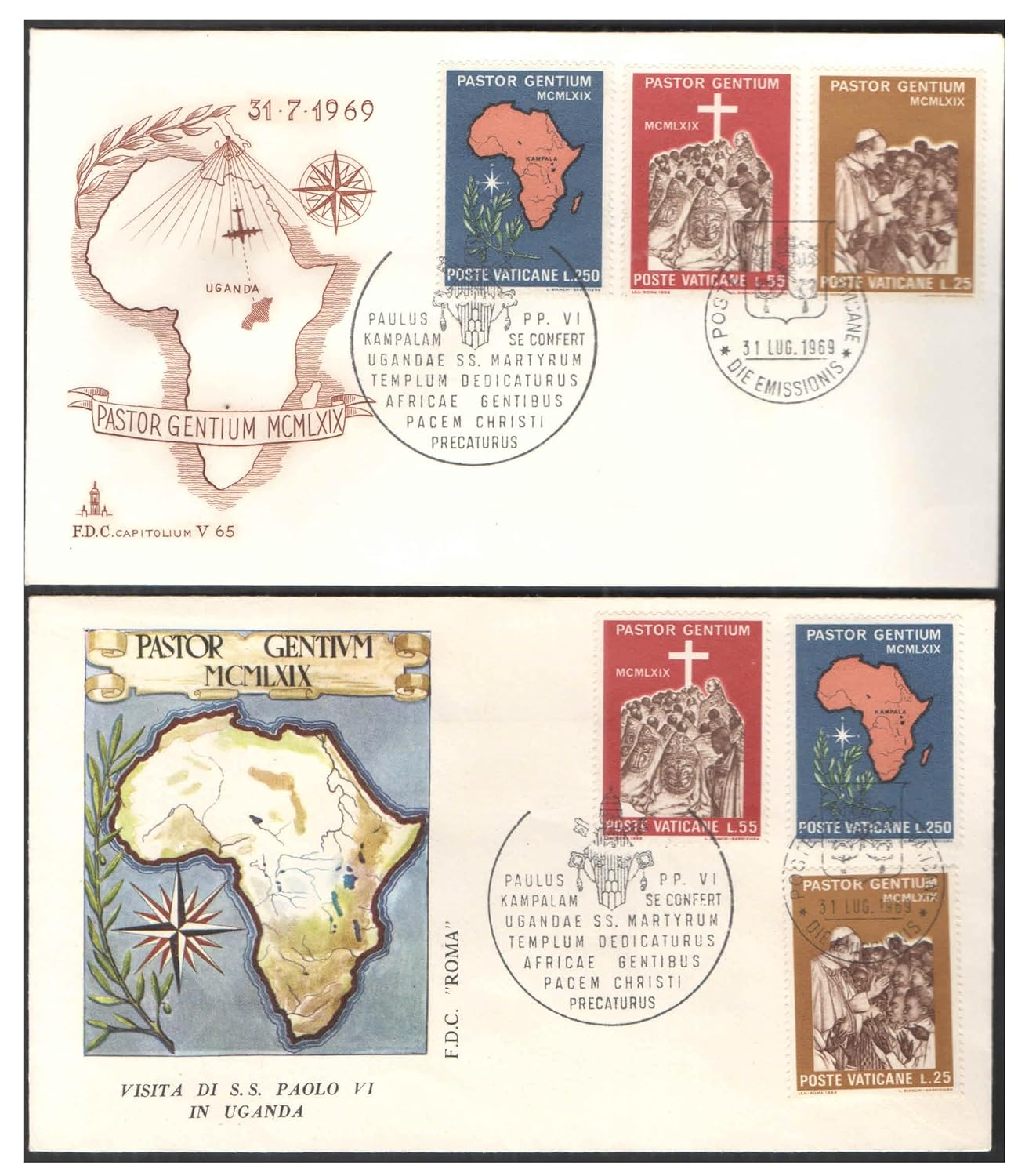 Vatican City 1969 – Visit of Pope Paolo VI to Kampala,Uganda – Set of 2 First Day Covers FDC with 3 Postage Stamps Each – for Collection