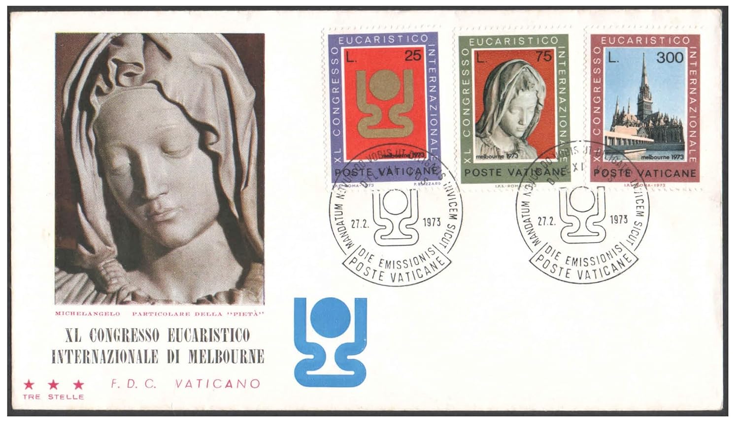 Vatican City 1973-40th International Eucharistic Congress – Emblem, Michelangelo’s Pieta, Cathedral Melbourne – First Day Cover FDC with 3 Postage Stamps